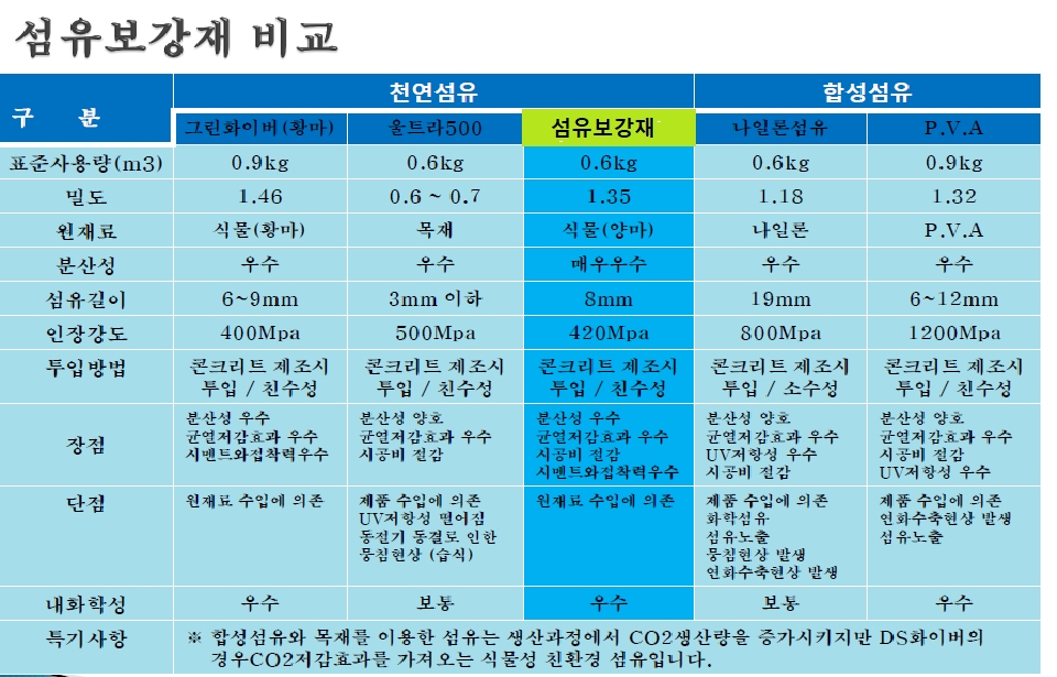 건조수축균열 등에 월등한 효과를 발휘하고 , 섬유의 가교작용을 통하여 충격 및 인장강도가 증가되며, 골재의 침하현상 감소와